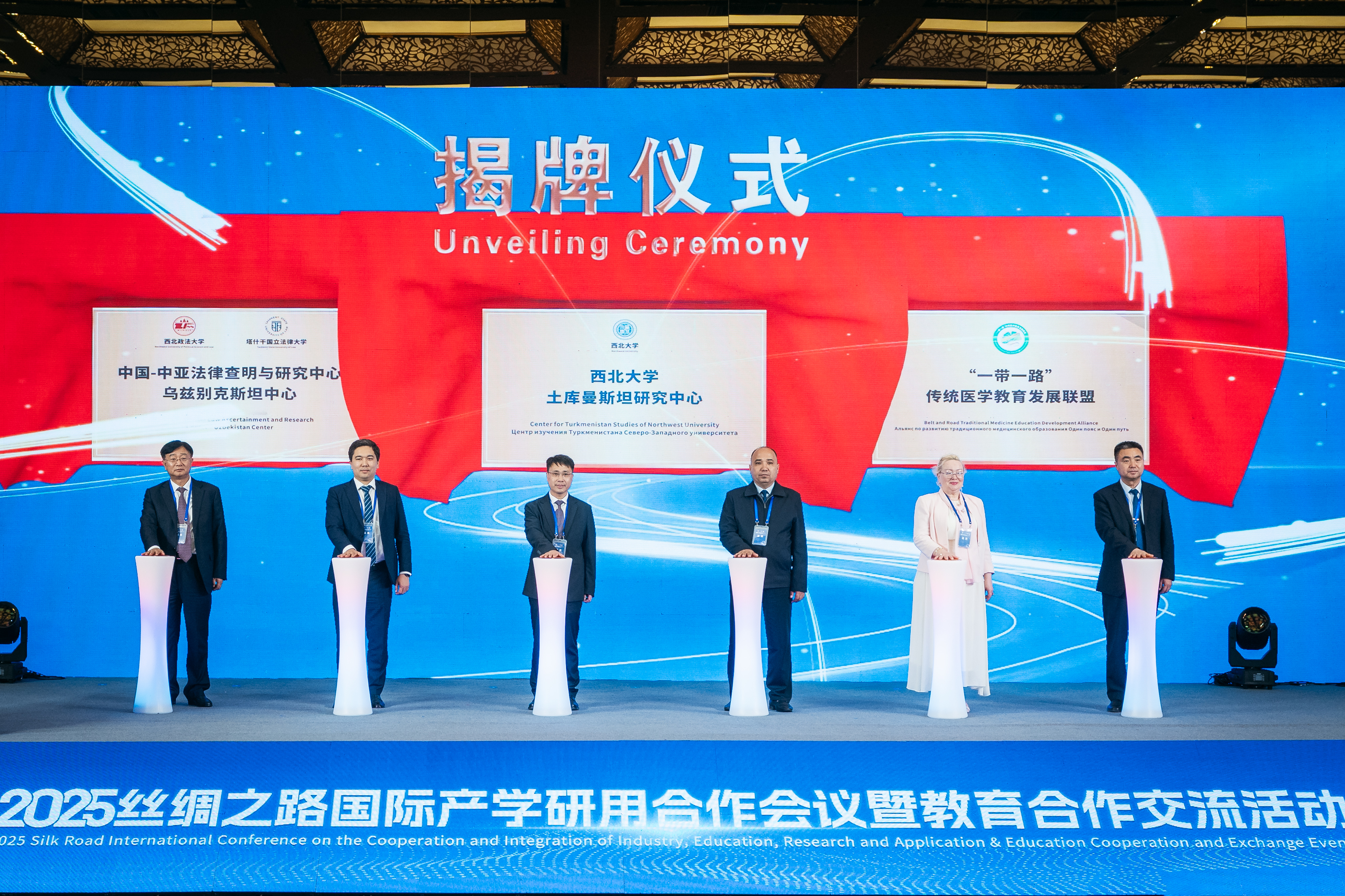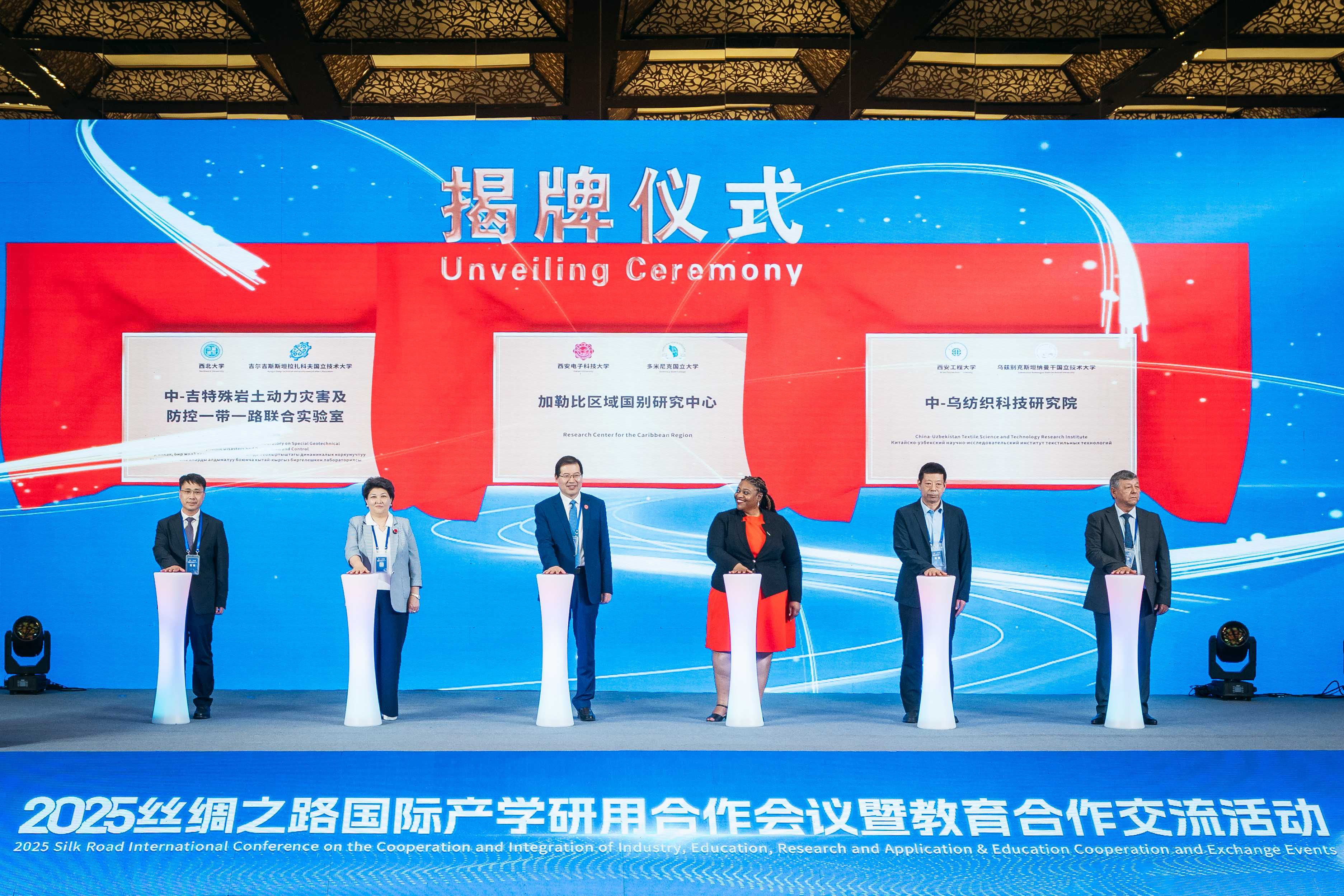 22日,由陕西省人民政府主办、陕西省教育厅承办的2025丝绸之路国际产学研用合作会议暨教育合作交流活动启动仪式上在西安召开。孙庆伟先后与吉尔吉斯拉扎科夫国立技术大学副校长瑟雷姆别科娃·伊布拉耶夫娜教授、土库曼斯坦科学院研究员塞尔达尔·马沙里科夫为“中-吉特殊岩土动力灾害及防控‘一带一路’联合实验室”“土库曼斯坦研究中心”揭牌。