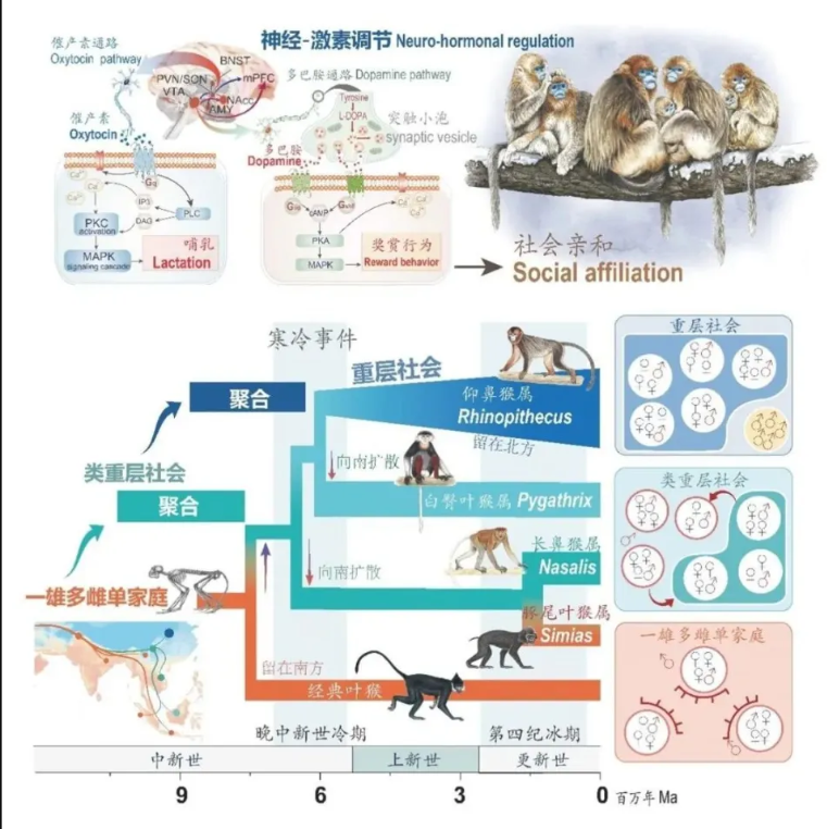 灵长类如何演化出多样的社会?MK在线金丝猴研究团队整合行为学、生态学、基因组学等多学科手段,设计出“社会-生态-基因组”全新研究范式。通过化石、古环境及现生生态等大数据挖掘,发现历史寒冷可能驱动社群聚集。进一步地,比较基因组学,细胞功能实验和行为学分析揭示寒冷效应引发催产素和多巴胺等脑、神经激素系统适应性遗传变异,间接增加个体友好行为及容忍度,促进单家庭群向重层社会聚集,从而系统回答灵长类社会演化之谜。