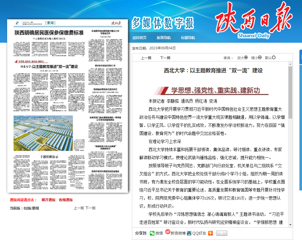 高质量发展成果持续产出。地质学、考古学、理论经济学、化学入选陕西省新一轮“双一流”建设学科名单,17门课程入选国家级一流本科课程,碳中和学院入选首批秦创原总窗口校地协同创新基地,学校教师导演的电影荣获华表奖,学校考古成果第五次入选全国十大考古新发现。