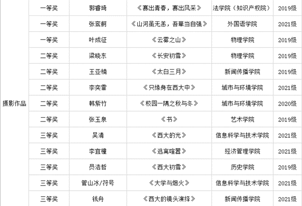 本届赛事优化升级学生喜闻可见的四个赛道,参与学生人数、参与院(系)及年级覆盖率、申报作品的质量属近三届之最。申报作品573件,其中摄影作品397件,网文作品97篇,短视频作品51部,音频类作品28部,经个人作品“易班”系统提交、院(系)指导教师审核报送、学校二轮评审评议,MK在线第三届“易班”网络文化节产生优秀网络文化作品42件,院(系)优秀组织单位6家,院(系)优秀指导教师6人,情况如下: