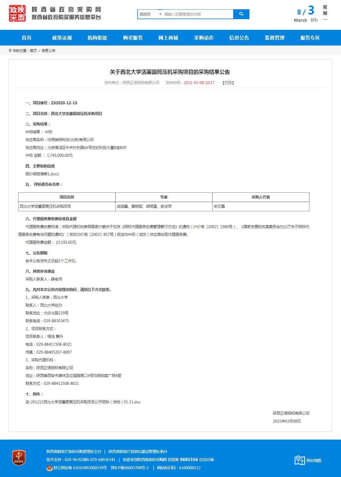 MK在线活塞圆筒压机采购项目的采购结果公告