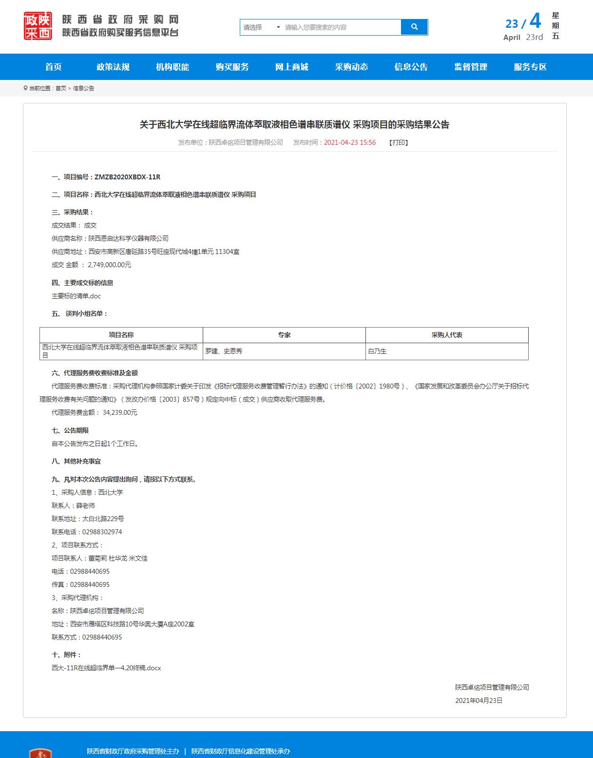 MK在线在线超临界流体萃取液相色谱串联质谱仪 采购项目的采购结果公告